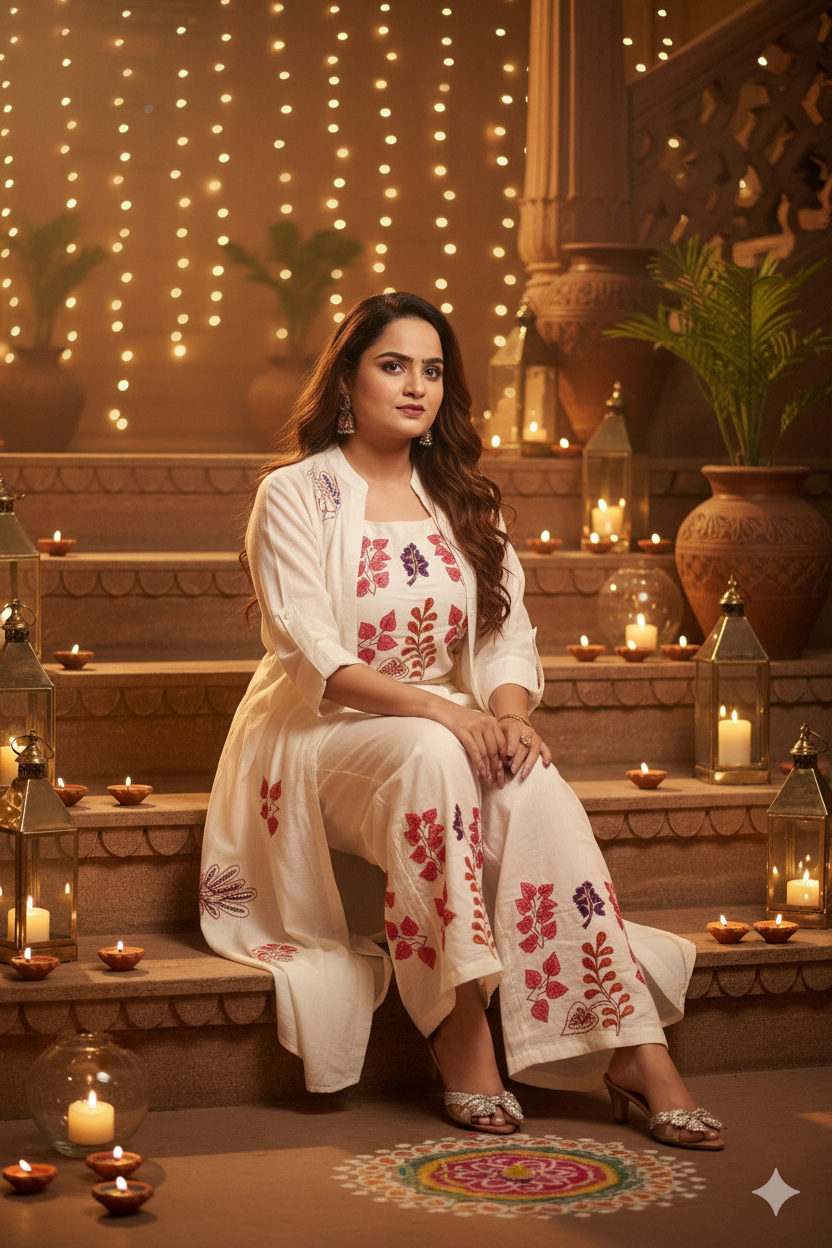 Ideal for Diwali parties, festive lunches, family celebrations, or intimate weddings, this ensemble brings understated glamour to every occasion. Its contemporary design with traditional hand embroidery makes it a standout festive favorite.