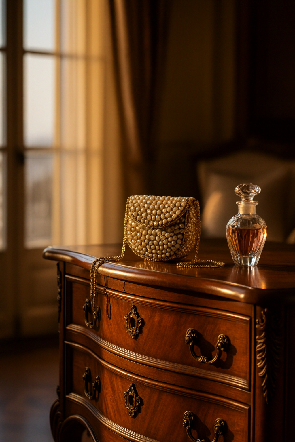 ๐ชก Material: Satin base with faux pearls and golden metallic finish
